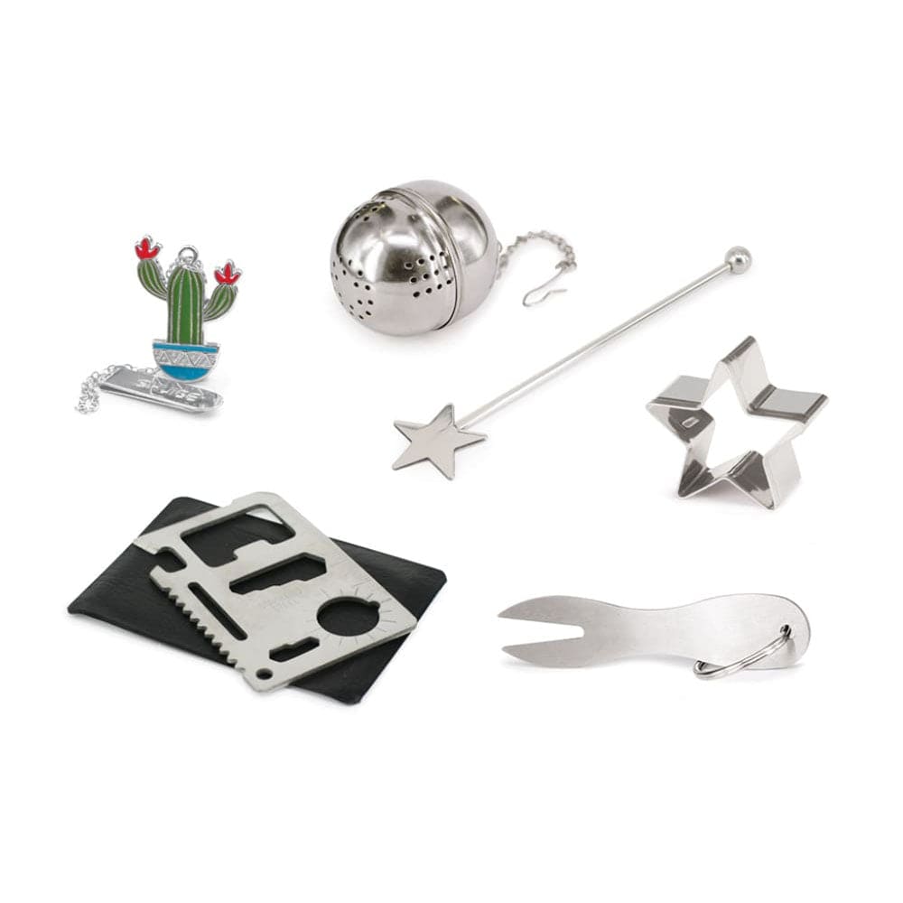 Each of the 6 crackers contains a paper hat, a satisfying snap, an amusing joke/motto and one of the reusable metal gifts pictured.