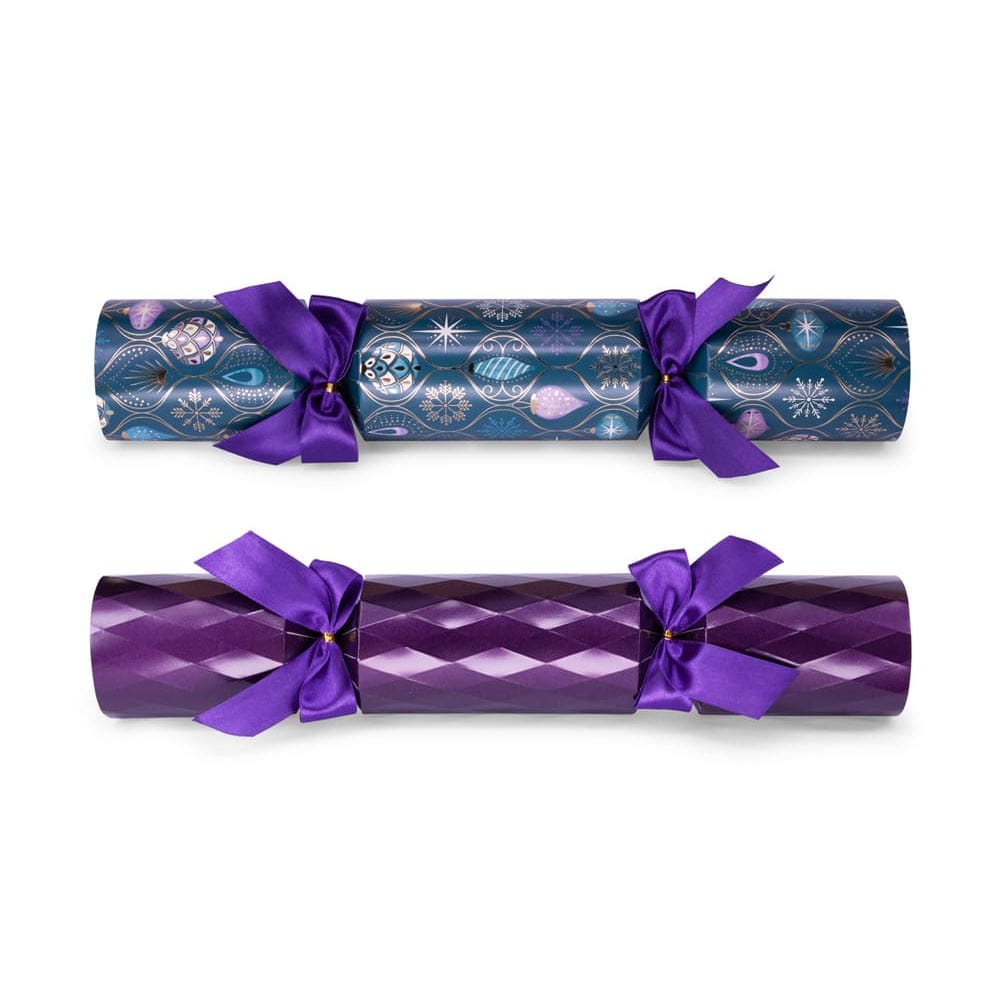 These handcrafted crackers beautifully capture the essence of winter festivities, combining the boldness of one purple embossed design, teamed with a bauble design with gold accents.