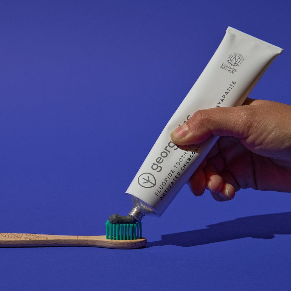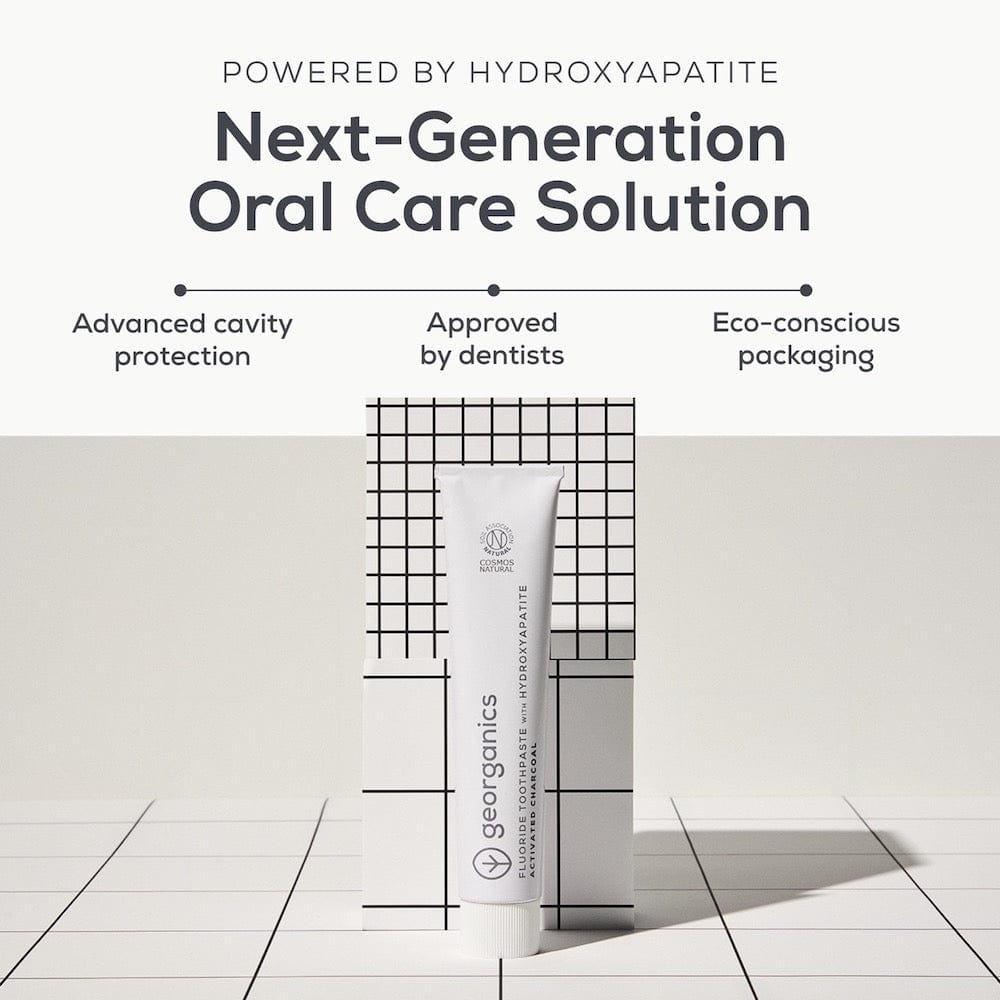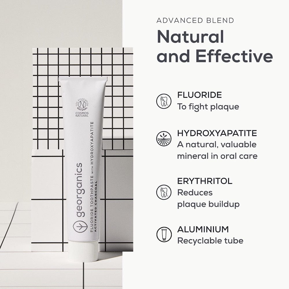 Experience the future of oral care with Georganics Activated Charcoal Toothpaste, formulated with a powerful combination of hydroxyapatite, fluoride, and erythritol. This advanced blend is designed to deliver superior protection, helping to remineralise tooth enamel, prevent cavities, and gently polish teeth.