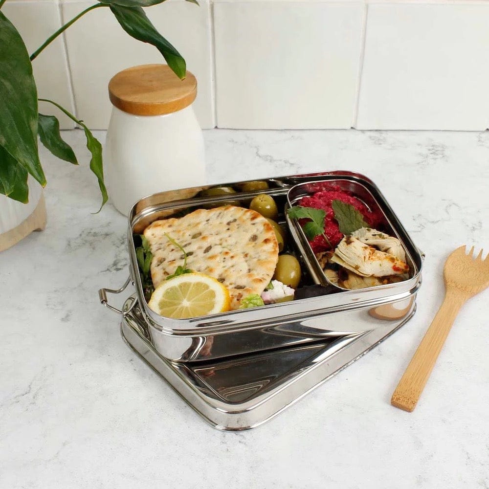 A rectangular stainless steel lunch box with clip closure and a separate mini container which fits inside. It is perfect for an 'on-the-go' balanced lunch of a savoury salad or sandwich, fruit and a snack to work in one neat container.