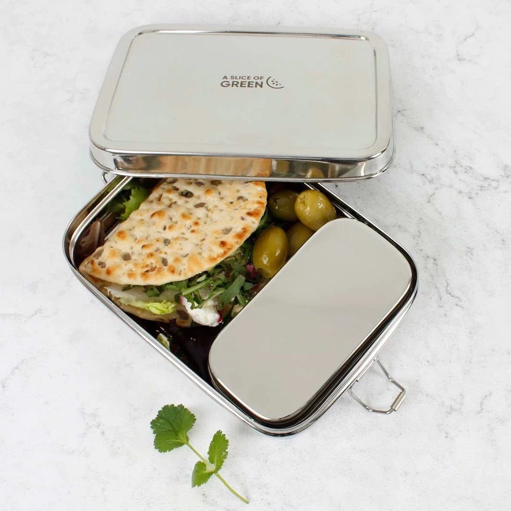 A Slice of Green containers are made from high quality, food grade 202 stainless steel and have folded, smooth edges. Stainless steel is non-toxic and non-leaching and will not retain or impart flavours.