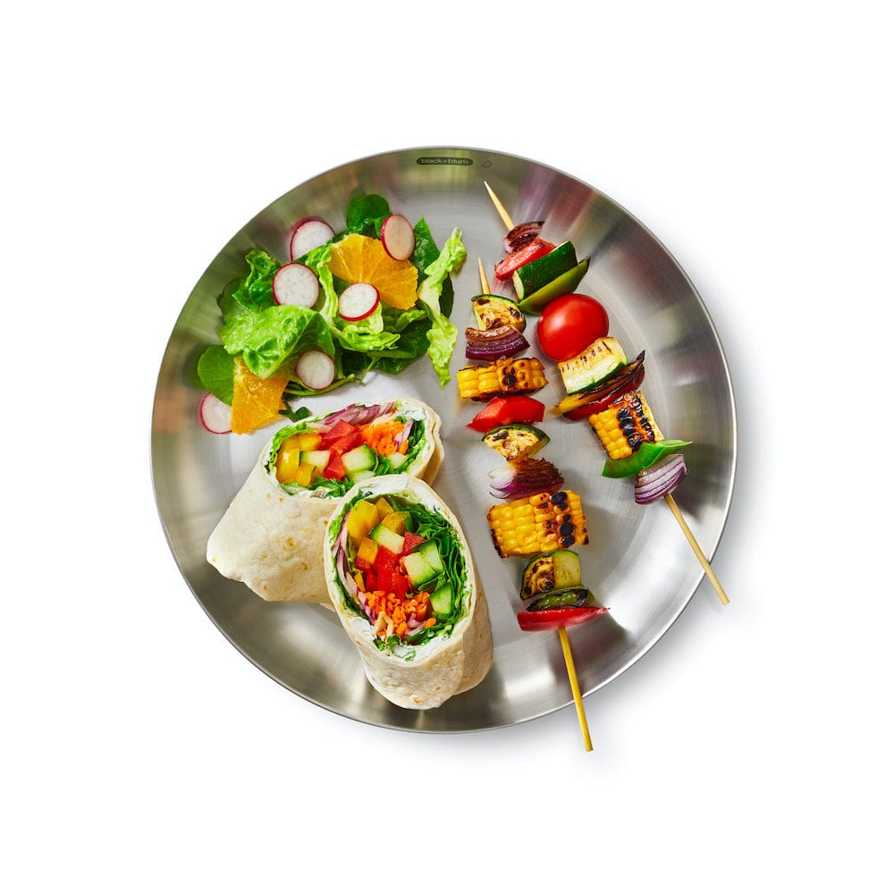 A set of 4 sturdy high quality steel plates that stack neatly together and are generously wide for all your al fresco feasts.