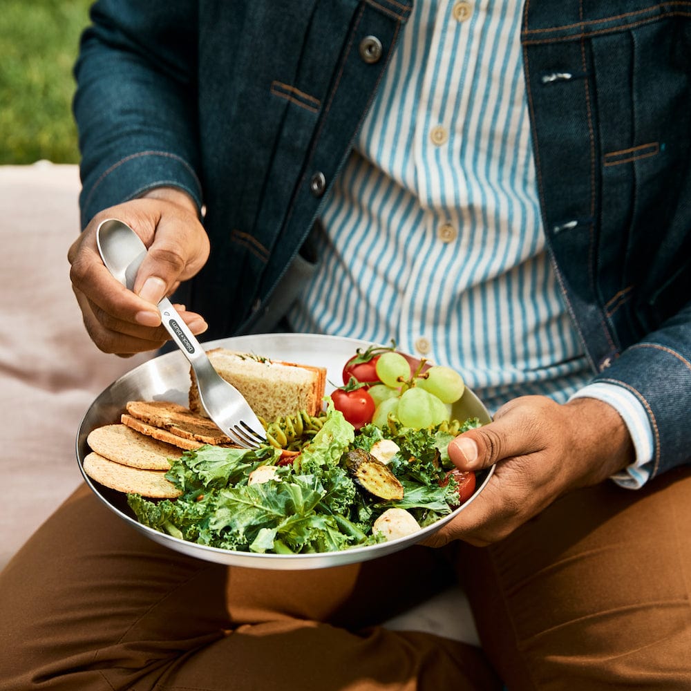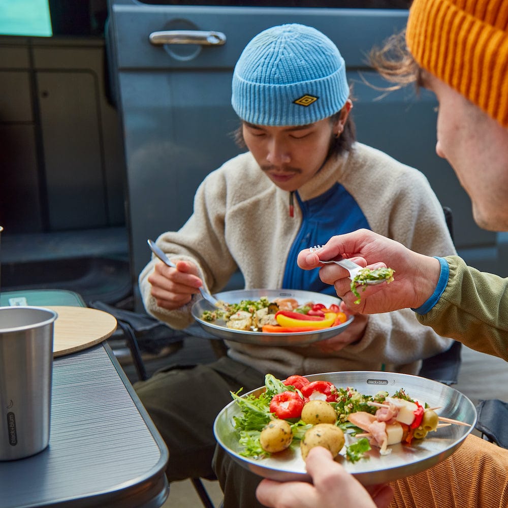Each plate is individually marked with a different fruit icon, so you’ll know which is yours. Genius 💡 Get the stacking steel cups with hidden bottle opener for the ultimate picnic kit.