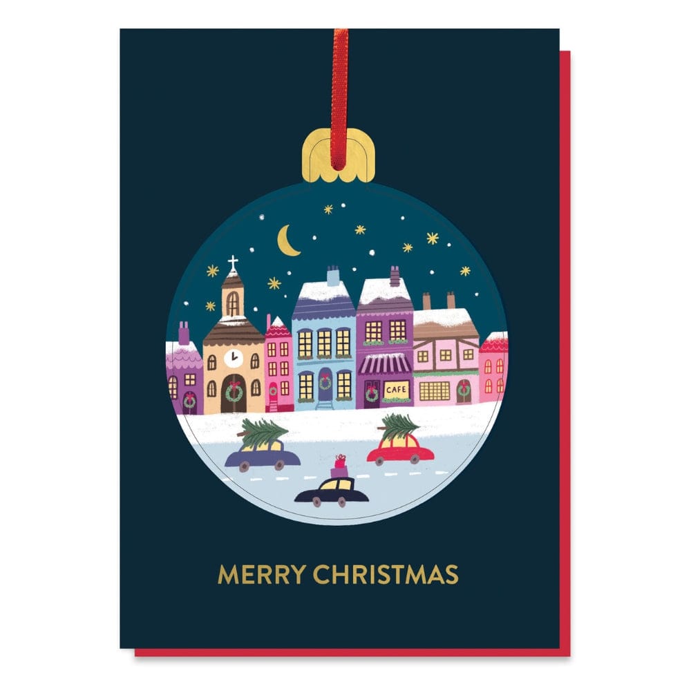 Send an extra special message this Christmas with this stunning Christmas Town Bauble card. The pretty snowy town sits under a twinkling gold starry sky.