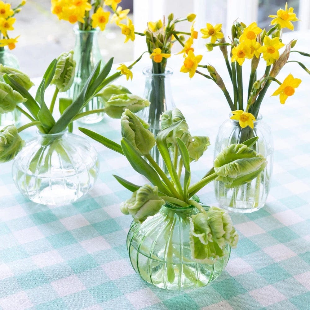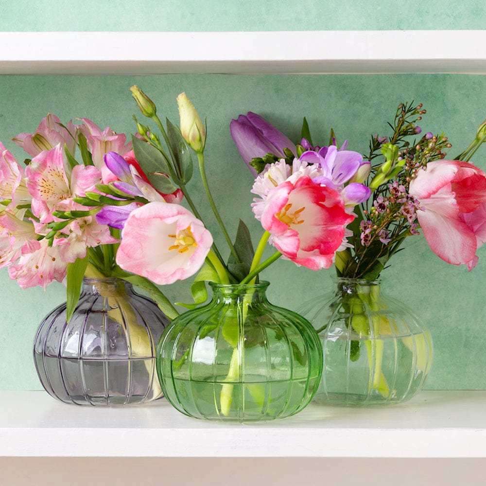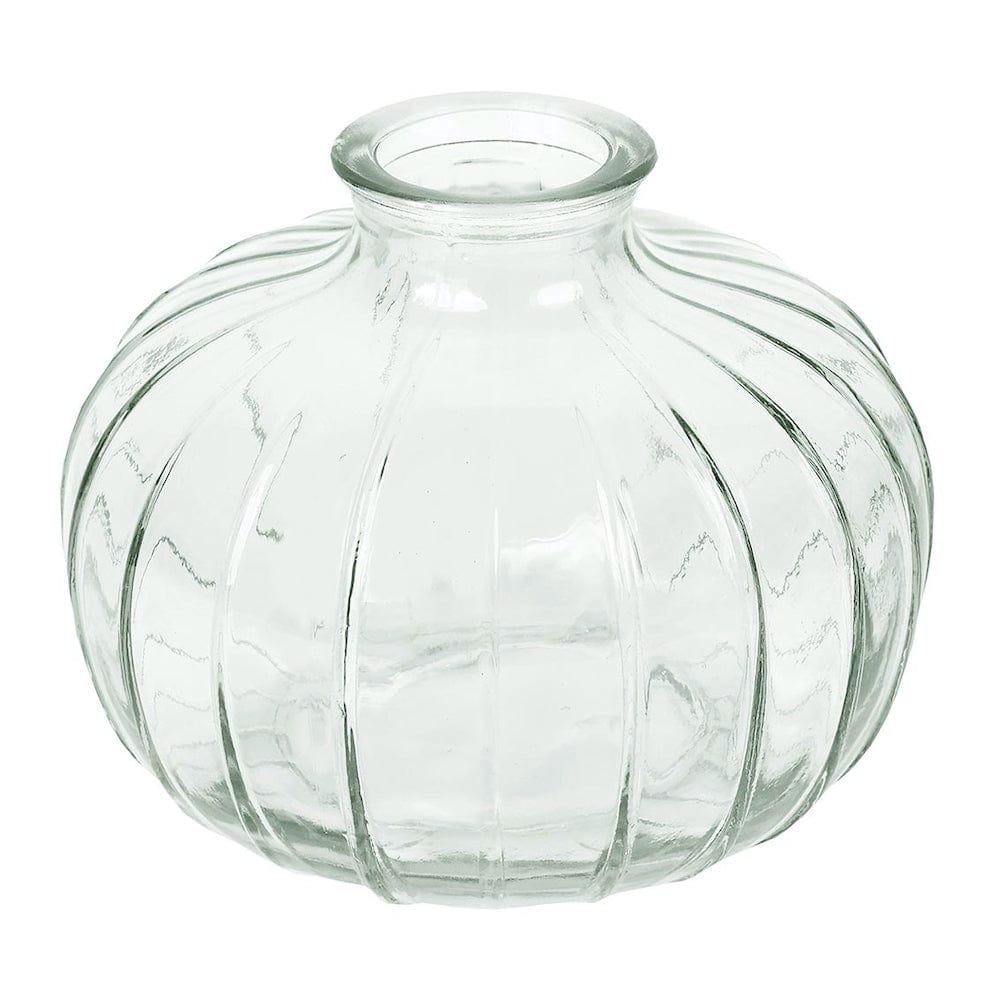 A stunning bulbous shape with stylish ribbing, this new design glass bud vase is a beautiful home for a single stem or a small bunch of freshly cut flowers. Place on a table spread, a mantlepiece or a windowsill and enjoy the glow of light through this vase. Perfect for any season.