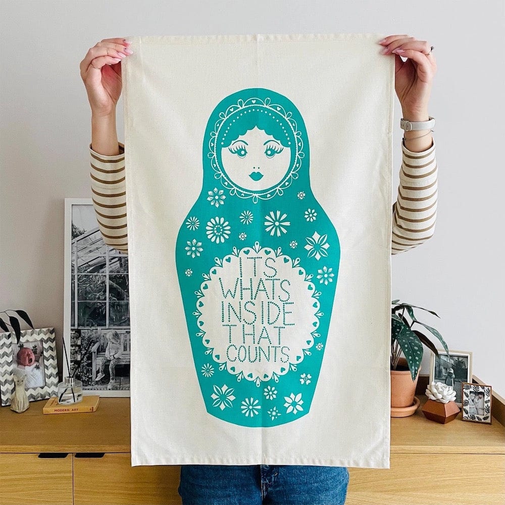 'It's What's Inside That Counts', truly lovely words, illustrated inside a beautiful Russian doll. Lovingly hand drawn by the artist, Hazel Nicholls.