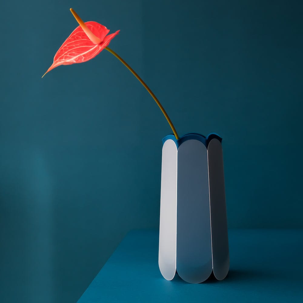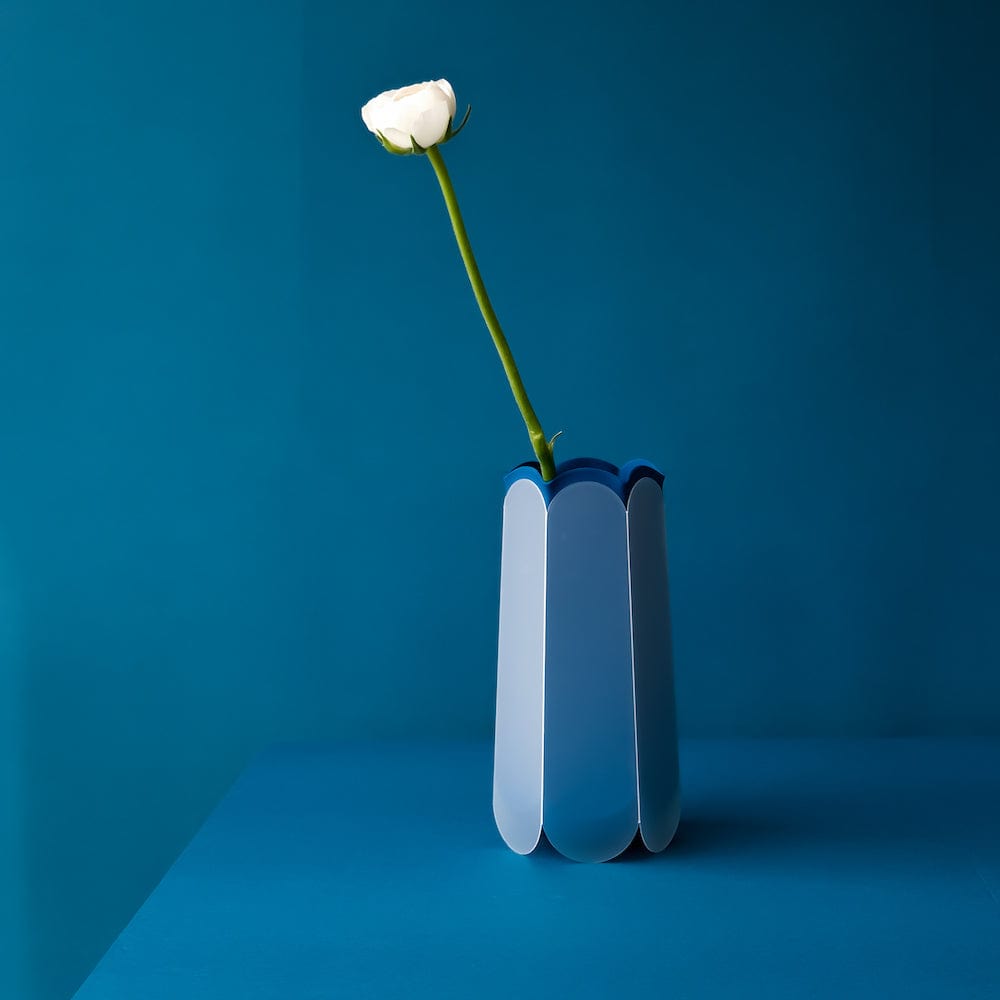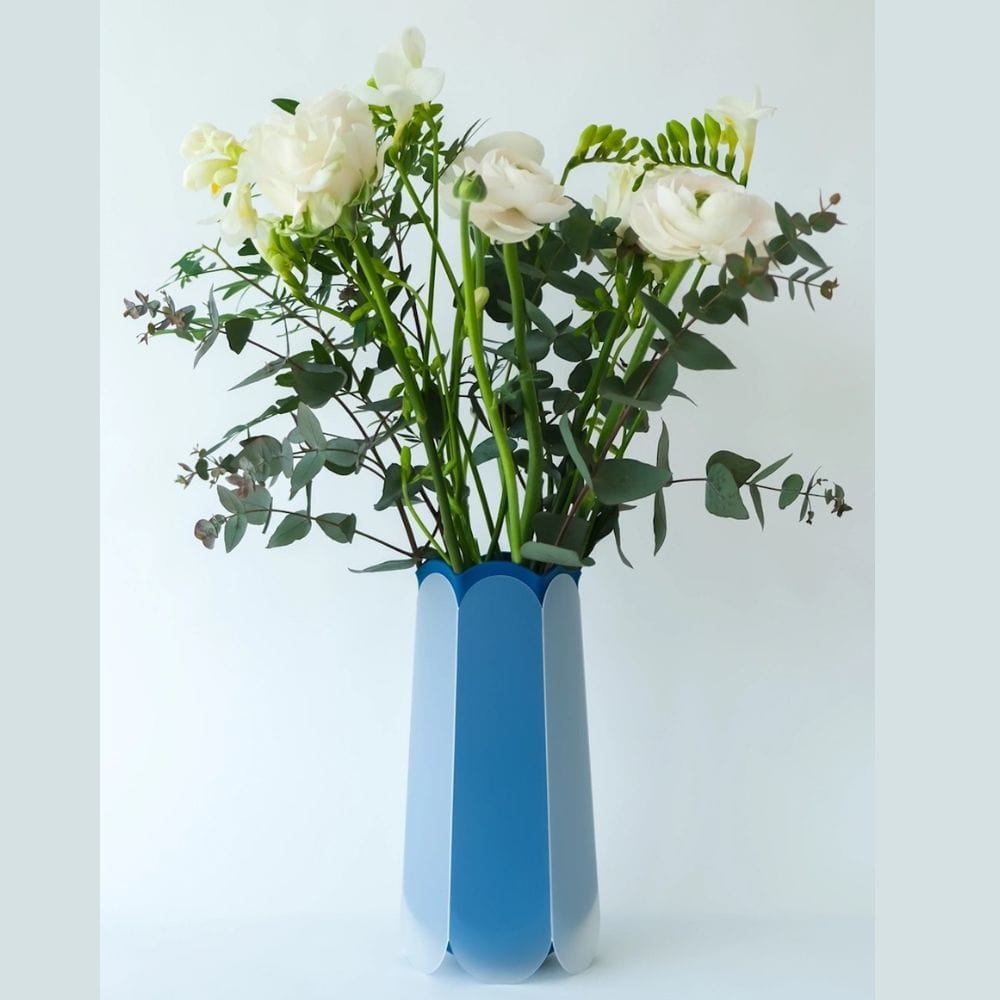 Made from recycled polypropylene and high grade silicone, the materials and the faceted design, allow the vase to fold symmetrically, resulting in a compressed size as little as 5mm thick. Once assembled, the tapered form, measuring 24cm tall, ensures the vase is stable and capable of holding a full bouquet of flowers and up to one litre of water.