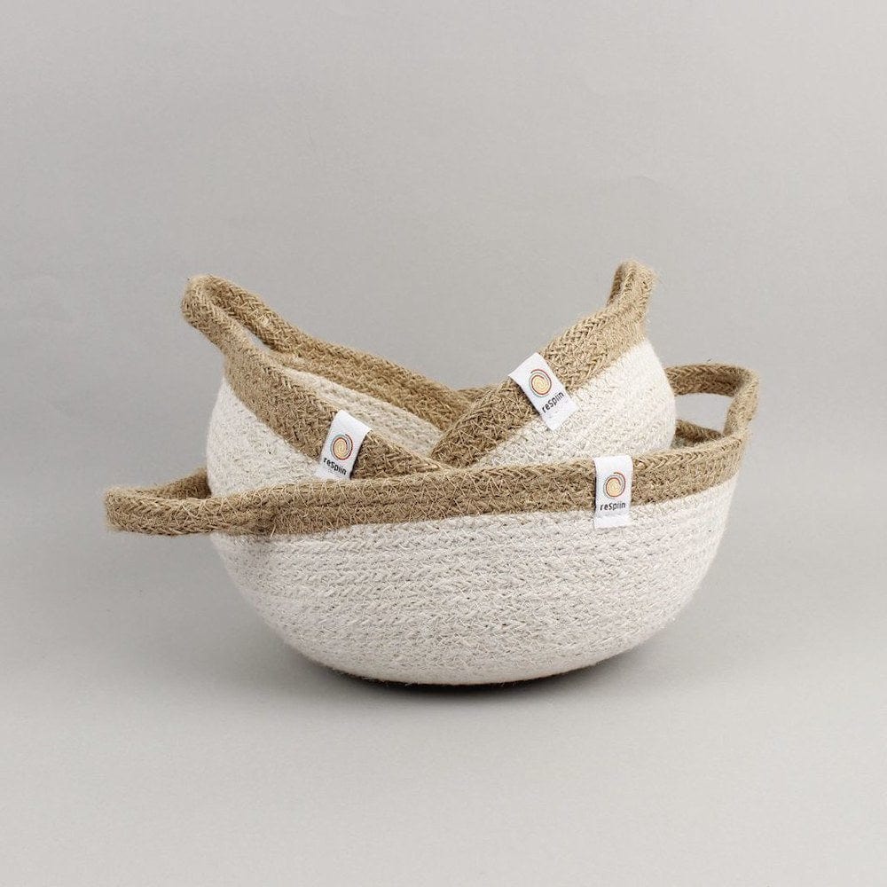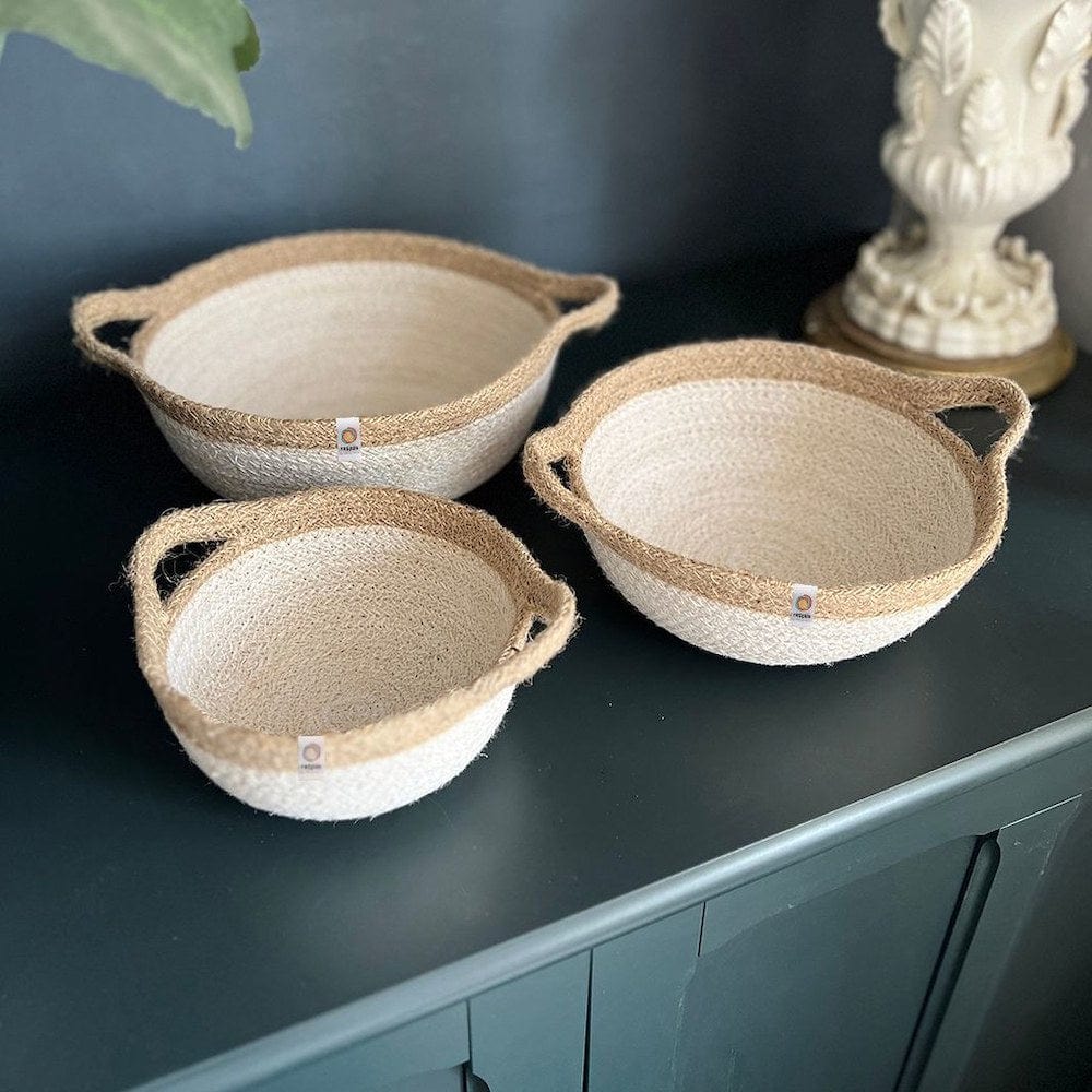 Set of three softly rounded jute bowls. The handles form part of the woven edging, making them practical and beautiful.