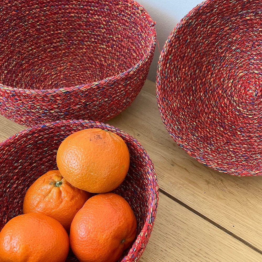 Leftover cotton thread from garment production is collected from factories. Instead of being thrown away, this cotton thread is twisted into a rope and sewn together to make new products. The colours in the rope will depend on the thread colours collected so no two products will ever be exactly the same.