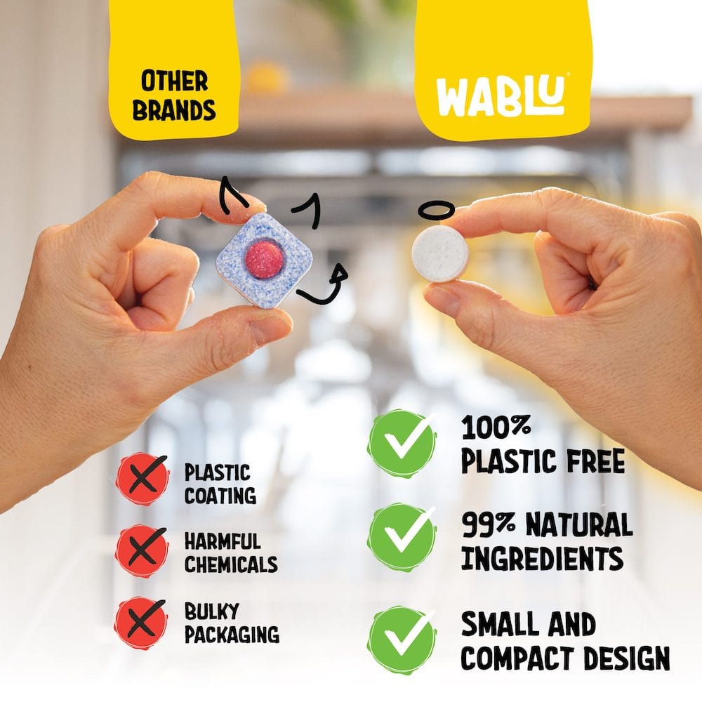 WABLU Dishwasher Naked Wonder Tabs® Bid farewell to grease and grime with the eco-friendly powerhouse for dazzling clean dishes. The ultra-concentrated, plant-based formula effortlessly cuts through stubborn grease and food residues, leaving every dish, glass, and utensil spotless and streak-free.